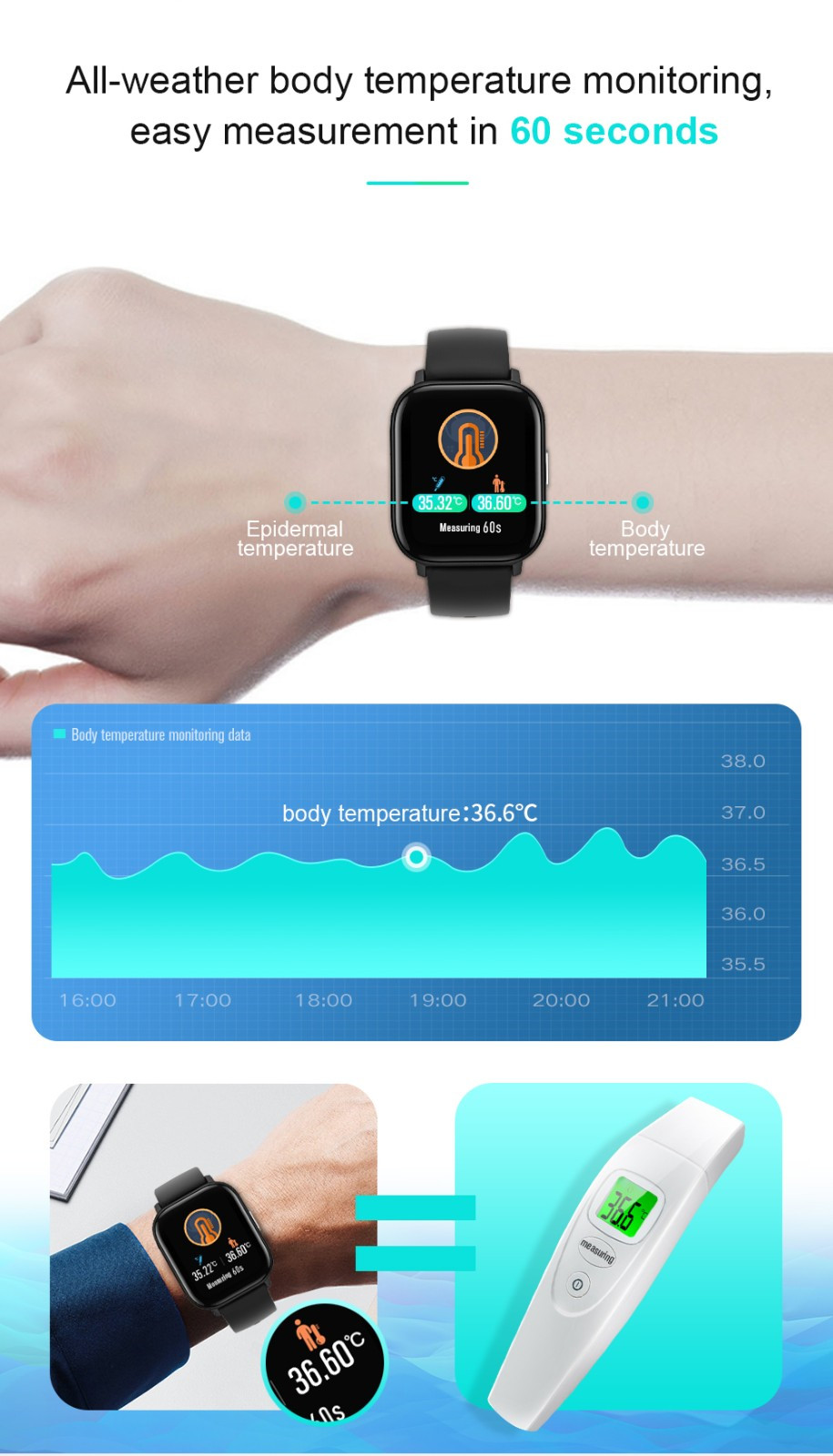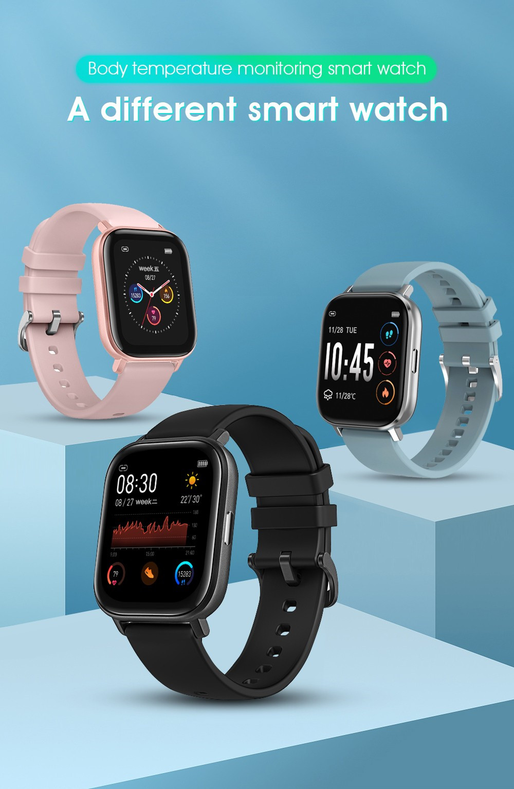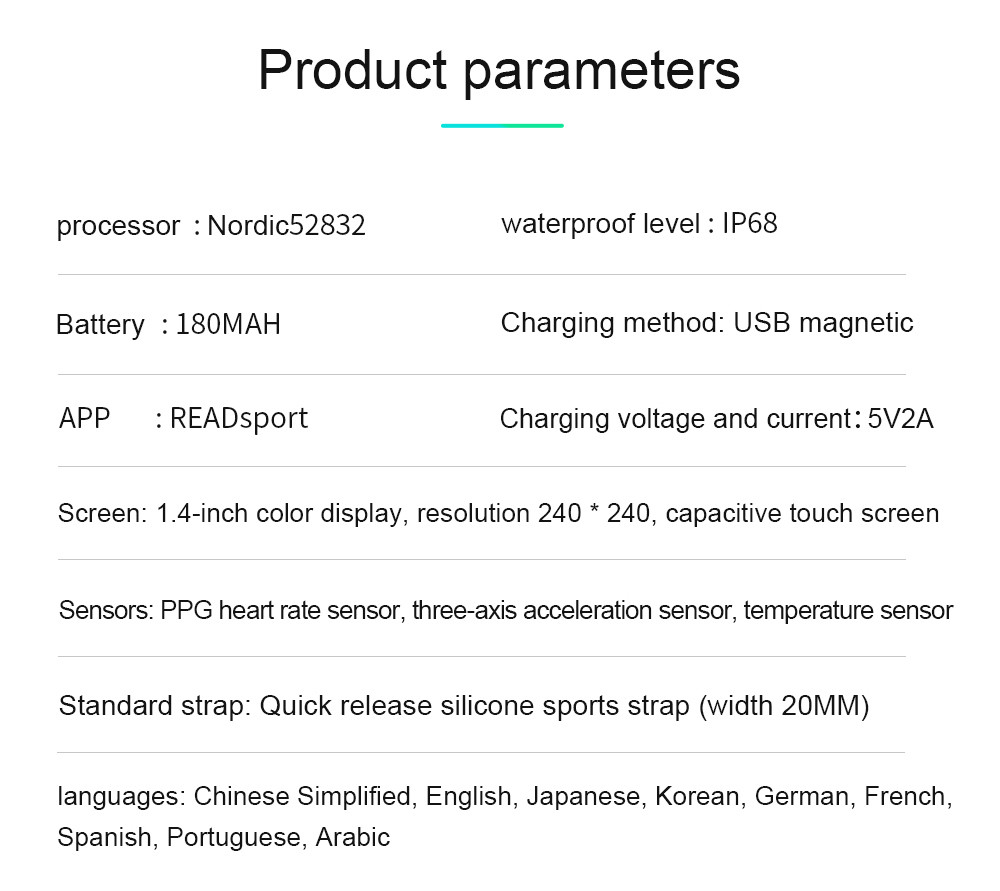 Product modeling:smartbracelet LCD specifications:1.4inch Resolution:240*240 Hardware platform:NRF52832 material:Zinc alloy Memory:64KB+512KB FLASH:64M bit Function Bluetooth:Bluetooth 4.0,supportAndroid and iOS system Multisport mode:support Heart Rate Detection:3300 optical heart rate sensor Body temperature:support Entspannen:support metronome:support Pedometer:support Sleep monitor:support G-SENSOR:support Information push:support Phone calls reminding:support Waterproof:support IP68 Vibration mode:support Side buttons:support Chargers:Magnet Pogo pin GPS:Not support APP name:READsport APP Languge:Chinese, Japanese, Korean, English, French, German, Spanish, Portuguese, Arabic, Russian watch language:China, Britain, Japan, France, Russia, Germany, Portugal, Spain, Arabia Machinery Features:Specifics Size(L*W*H):43.25*36.25*9.5mm Battery:180MA Color:Rose gold, black, silver Package size:102*83*68MM